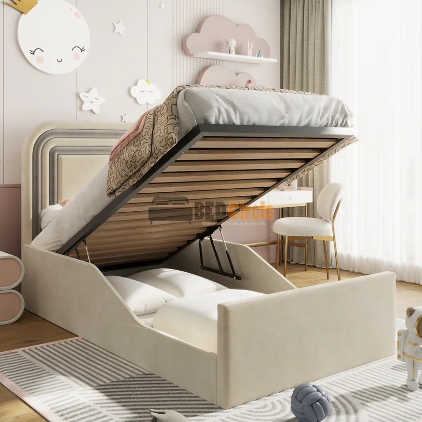Designed to blend effortlessly with a variety of bedroom styles, the Dreambow Kids Bed offers both comfort and durability. Its sturdy frame ensures long-lasting support, while the choice of base options allows you to tailor the bed to your child’s needs—whether that’s enhanced mattress ventilation with slats or added practicality with an ottoman storage base.