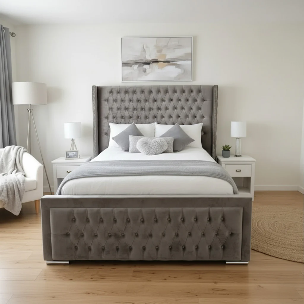 The Empress Luxury Wing Chesterfield Bed is designed to make a bold yet sophisticated statement in any bedroom. With its Spanish buttoned Chesterfield design, thick padded upholstery, and distinctive curved winged sides, this bed exudes timeless elegance and luxury. The wings protrude outward, increasing the headboard width by approximately 5 inches on each side, giving your bedroom a truly unique focal point.