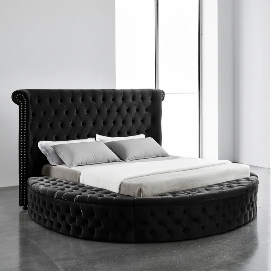 The Round Box Chesterfield Bed combines timeless Chesterfield charm with modern functionality. Its rounded design, luxurious deep-buttoned upholstery, and optional storage make it a statement piece that elevates any bedroom while providing practical comfort.